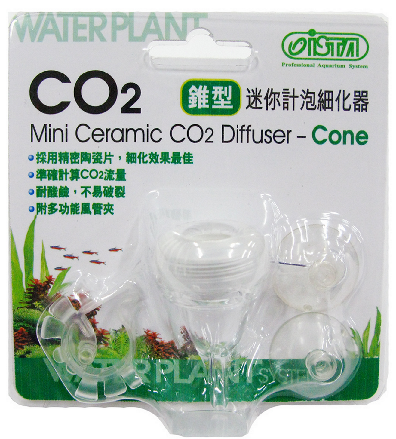 The ISTA Mini Ceramic CO2 Diffuser small Cone size and stylish design makes it perfect for nano tanks. Top quality ceramic assures the best diffusing effect. 2 in 1 function: CO2 bubble counter and diffuser. Unit comes apart for easy ceramic replacement, cleaning and water filling. Acrylic material provides clear CO2 bubble reading and also acid and break resistant. CO2 pipe holder included to prevent CO2 pipe from bending.