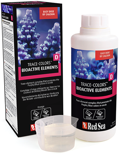 Red Sea Coral Color D: A complex of 18 trace elements. These 18 elements (out of all the trace elements in NSW) participate in the metabolic processes inside a coral™s skeleton and soft tissue. D elements are related to the blue/purplechromo-proteins.